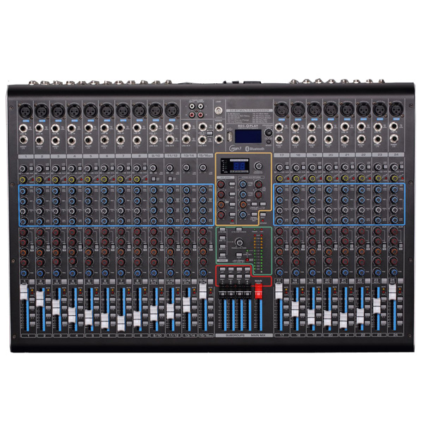 1-24路單聲道以及立體聲均具有發送至L-R主通道、編組GR1-2、編組GR3-4以及 監聽PFL按鍵并具有監聽指示黃燈;